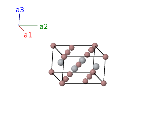 | $\mathbf{B_{2}}$ | = | $\frac{1}{2} \, \mathbf{a}_{1}+\frac{1}{2} \, \mathbf{a}_{2}+\frac{1}{2} \, \mathbf{a}_{3}$ | = | $\frac{1}{2}a \,\mathbf{\hat{x}}+\frac{1}{2}a \,\mathbf{\hat{y}}+\frac{1}{2}c \,\mathbf{\hat{z}}$ | (1d) | Ga II |