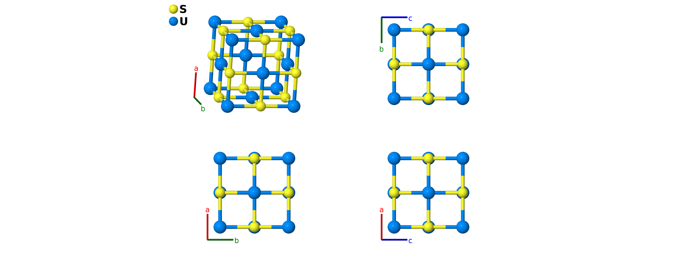 • The ICSD entry for this structure uses a = 5.505Å, but (Zumbush, 1940) states that the correct value is 5.49Å. As this is consistent with the S-S and S-U distances given in the paper we use this value.