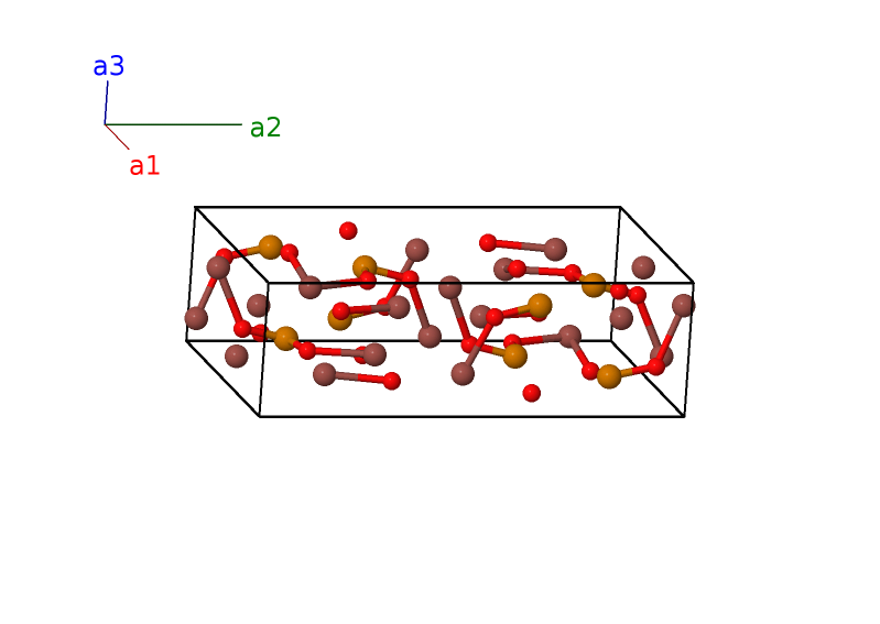 | $\mathbf{B_{12}}$ | = | $x_{2} \, \mathbf{a}_{1}- \left(y_{2} - \frac{1}{2}\right) \, \mathbf{a}_{2}- z_{2} \, \mathbf{a}_{3}$ | = | $a x_{2} \,\mathbf{\hat{x}}- b \left(y_{2} - \frac{1}{2}\right) \,\mathbf{\hat{y}}- c z_{2} \,\mathbf{\hat{z}}$ | (8m) | O II |
