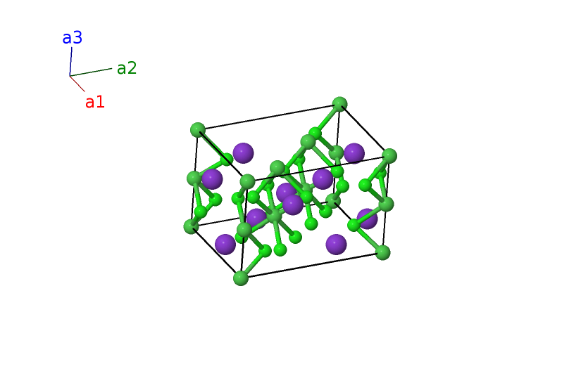 | $\mathbf{B_{25}}$ | = | $- y_{5} \, \mathbf{a}_{1}- x_{5} \, \mathbf{a}_{2}+\left(z_{5} + \frac{1}{2}\right) \, \mathbf{a}_{3}$ | = | $- \frac{1}{2}a \left(x_{5} + y_{5}\right) \,\mathbf{\hat{x}}- \frac{\sqrt{3}}{2}a \left(x_{5} - y_{5}\right) \,\mathbf{\hat{y}}+c \left(z_{5} + \frac{1}{2}\right) \,\mathbf{\hat{z}}$ | (12d) | Cl II |