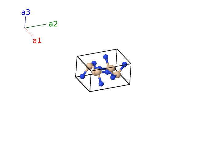 | $\mathbf{B_{1}}$ | = | $\frac{1}{3} \, \mathbf{a}_{1}+\frac{2}{3} \, \mathbf{a}_{2}+\frac{1}{4} \, \mathbf{a}_{3}$ | = | $\frac{1}{2}a \,\mathbf{\hat{x}}+\frac{\sqrt{3}}{6}a \,\mathbf{\hat{y}}+\frac{1}{4}c \,\mathbf{\hat{z}}$ | (2c) | N I |