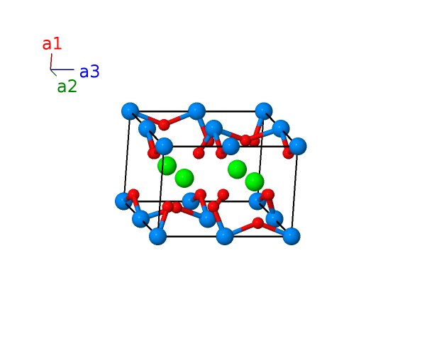 | $\mathbf{B_{18}}$ | = | $- x_{5} \, \mathbf{a}_{1}- y_{5} \, \mathbf{a}_{2}+\left(z_{5} + \frac{1}{2}\right) \, \mathbf{a}_{3}$ | = | $- a x_{5} \,\mathbf{\hat{x}}- b y_{5} \,\mathbf{\hat{y}}+c \left(z_{5} + \frac{1}{2}\right) \,\mathbf{\hat{z}}$ | (8e) | O III |