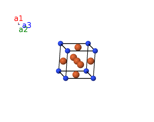 | $\mathbf{B_{3}}$ | = | $\frac{1}{2} \, \mathbf{a}_{2}+\frac{1}{2} \, \mathbf{a}_{3}$ | = | $\frac{1}{2}a \,\mathbf{\hat{y}}+\frac{1}{2}a \,\mathbf{\hat{z}}$ | (3c) | Fe II |