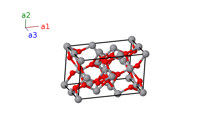 | $\mathbf{B_{12}}$ | = | $x_{5} \, \mathbf{a}_{1}- y_{5} \, \mathbf{a}_{2}+\left(z_{5} + \frac{1}{2}\right) \, \mathbf{a}_{3}$ | = | $\left(a x_{5} + c \left(z_{5} + \frac{1}{2}\right) \cos{\beta}\right) \,\mathbf{\hat{x}}- b y_{5} \,\mathbf{\hat{y}}+c \left(z_{5} + \frac{1}{2}\right) \sin{\beta} \,\mathbf{\hat{z}}$ | (4g) | O III |