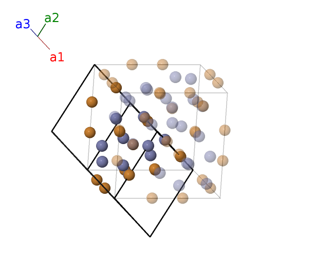 | $\mathbf{B_{2}}$ | = | $- 2 x_{1} \, \mathbf{a}_{3}$ | = | $- a x_{1} \,\mathbf{\hat{x}}- a x_{1} \,\mathbf{\hat{y}}+a x_{1} \,\mathbf{\hat{z}}$ | (8c) | Cu I |