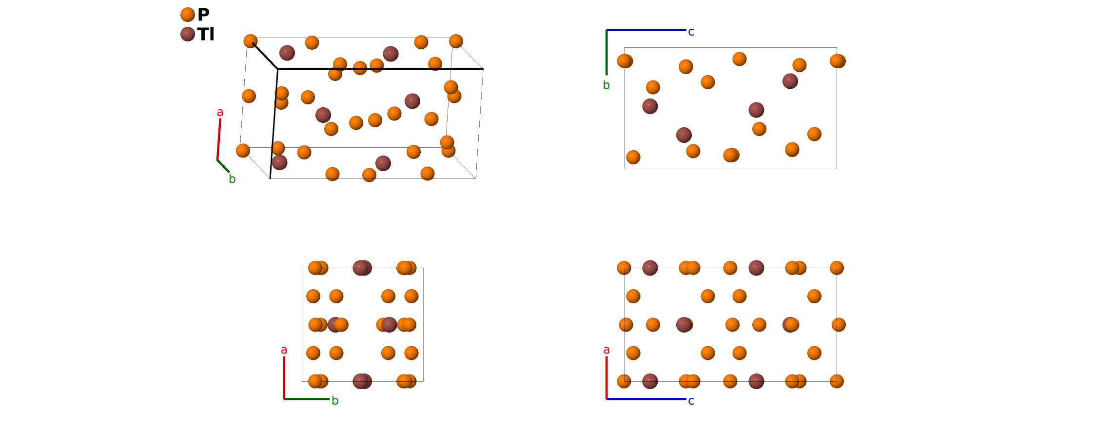 | $\mathbf{B_{16}}$ | = | $\frac{1}{2} \, \mathbf{a}_{1}- y_{8} \, \mathbf{a}_{2}+\left(z_{8} + \frac{1}{2}\right) \, \mathbf{a}_{3}$ | = | $\frac{1}{2}a \,\mathbf{\hat{x}}- b y_{8} \,\mathbf{\hat{y}}+c \left(z_{8} + \frac{1}{2}\right) \,\mathbf{\hat{z}}$ | (2b) | Tl II |