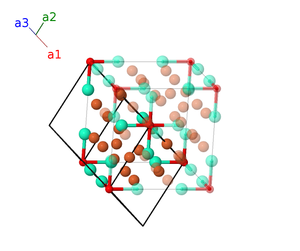 | $\mathbf{B_{2}}$ | = | $\frac{1}{2} \, \mathbf{a}_{1}+\frac{1}{2} \, \mathbf{a}_{2}+\frac{1}{2} \, \mathbf{a}_{3}$ | = | $\frac{1}{4}a \,\mathbf{\hat{x}}+\frac{1}{4}a \,\mathbf{\hat{y}}+\frac{1}{4}a \,\mathbf{\hat{z}}$ | (8c) | Fe I |
