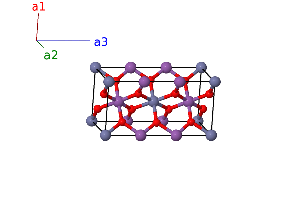 | $\mathbf{B_{9}}$ | = | $- \left(x_{3} - \frac{1}{2}\right) \, \mathbf{a}_{1}+\left(x_{3} + \frac{1}{2}\right) \, \mathbf{a}_{2}+\frac{1}{2} \, \mathbf{a}_{3}$ | = | $- a \left(x_{3} - \frac{1}{2}\right) \,\mathbf{\hat{x}}+a \left(x_{3} + \frac{1}{2}\right) \,\mathbf{\hat{y}}+\frac{1}{2}c \,\mathbf{\hat{z}}$ | (4f) | O I |