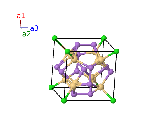 | $\mathbf{B_{2}}$ | = | $\frac{1}{2} \, \mathbf{a}_{1}+\frac{1}{2} \, \mathbf{a}_{2}+\frac{1}{2} \, \mathbf{a}_{3}$ | = | $\frac{1}{2}a \,\mathbf{\hat{x}}+\frac{1}{2}a \,\mathbf{\hat{y}}+\frac{1}{2}a \,\mathbf{\hat{z}}$ | (1b) | Cl I |