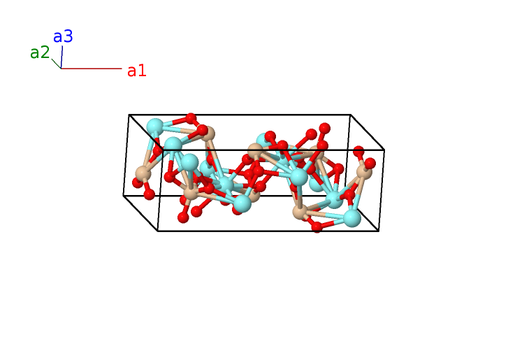 | $\mathbf{B_{6}}$ | = | $- \left(x_{2} - \frac{1}{2}\right) \, \mathbf{a}_{1}+\frac{3}{4} \, \mathbf{a}_{2}+\left(z_{2} + \frac{1}{2}\right) \, \mathbf{a}_{3}$ | = | $- a \left(x_{2} - \frac{1}{2}\right) \,\mathbf{\hat{x}}+\frac{3}{4}b \,\mathbf{\hat{y}}+c \left(z_{2} + \frac{1}{2}\right) \,\mathbf{\hat{z}}$ | (4c) | O II |