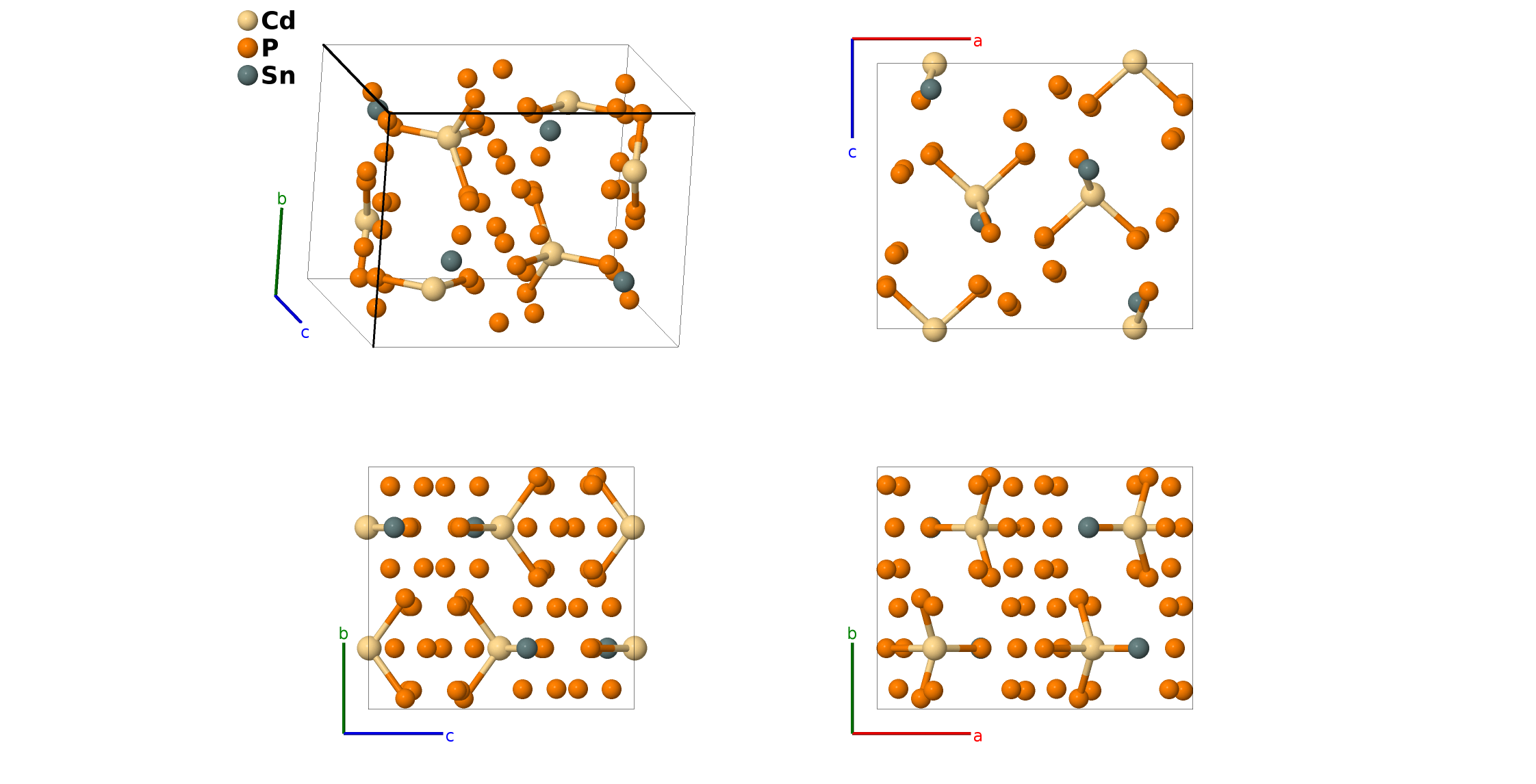 | $\mathbf{B_{4}}$ | = | $\left(x_{1} + \frac{1}{2}\right) \, \mathbf{a}_{1}+\frac{1}{4} \, \mathbf{a}_{2}- \left(z_{1} - \frac{1}{2}\right) \, \mathbf{a}_{3}$ | = | $a \left(x_{1} + \frac{1}{2}\right) \,\mathbf{\hat{x}}+\frac{1}{4}b \,\mathbf{\hat{y}}- c \left(z_{1} - \frac{1}{2}\right) \,\mathbf{\hat{z}}$ | (4c) | Cd I |