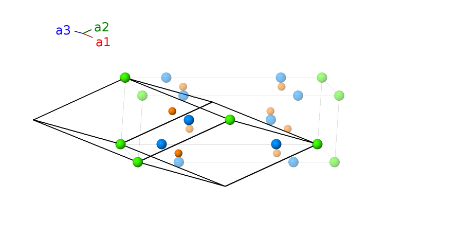 \[ \begin{array}{ccc} \mathbf{a_{1}}&=&- \frac{1}{2}a \,\mathbf{\hat{x}}+\frac{1}{2}a \,\mathbf{\hat{y}}+\frac{1}{2}c \,\mathbf{\hat{z}}\\\mathbf{a_{2}}&=&\frac{1}{2}a \,\mathbf{\hat{x}}- \frac{1}{2}a \,\mathbf{\hat{y}}+\frac{1}{2}c \,\mathbf{\hat{z}}\\\mathbf{a_{3}}&=&\frac{1}{2}a \,\mathbf{\hat{x}}+\frac{1}{2}a \,\mathbf{\hat{y}}- \frac{1}{2}c \,\mathbf{\hat{z}} \end{array}\]