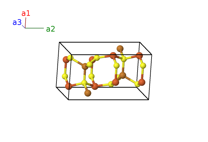 | $\mathbf{B_{3}}$ | = | $- x_{1} \, \mathbf{a}_{1}+\frac{3}{4} \, \mathbf{a}_{2}- z_{1} \, \mathbf{a}_{3}$ | = | $- a x_{1} \,\mathbf{\hat{x}}+\frac{3}{4}b \,\mathbf{\hat{y}}- c z_{1} \,\mathbf{\hat{z}}$ | (4c) | Cu I |