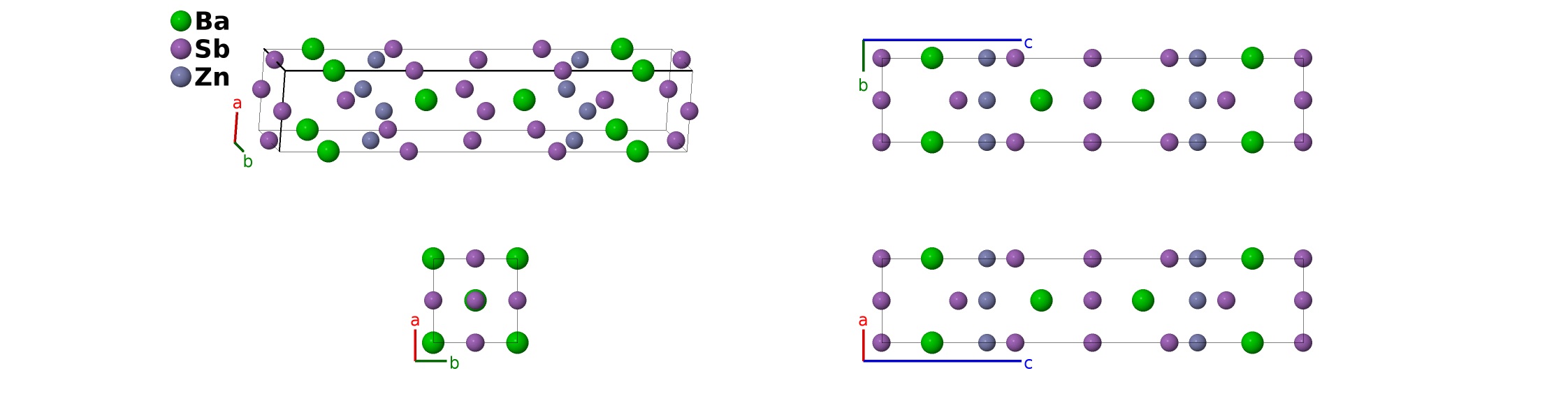 | $\mathbf{B_{4}}$ | = | $\frac{1}{4} \, \mathbf{a}_{1}+\frac{3}{4} \, \mathbf{a}_{2}+\frac{1}{2} \, \mathbf{a}_{3}$ | = | $\frac{1}{2}a \,\mathbf{\hat{x}}+\frac{1}{4}c \,\mathbf{\hat{z}}$ | (4d) | Zn I |