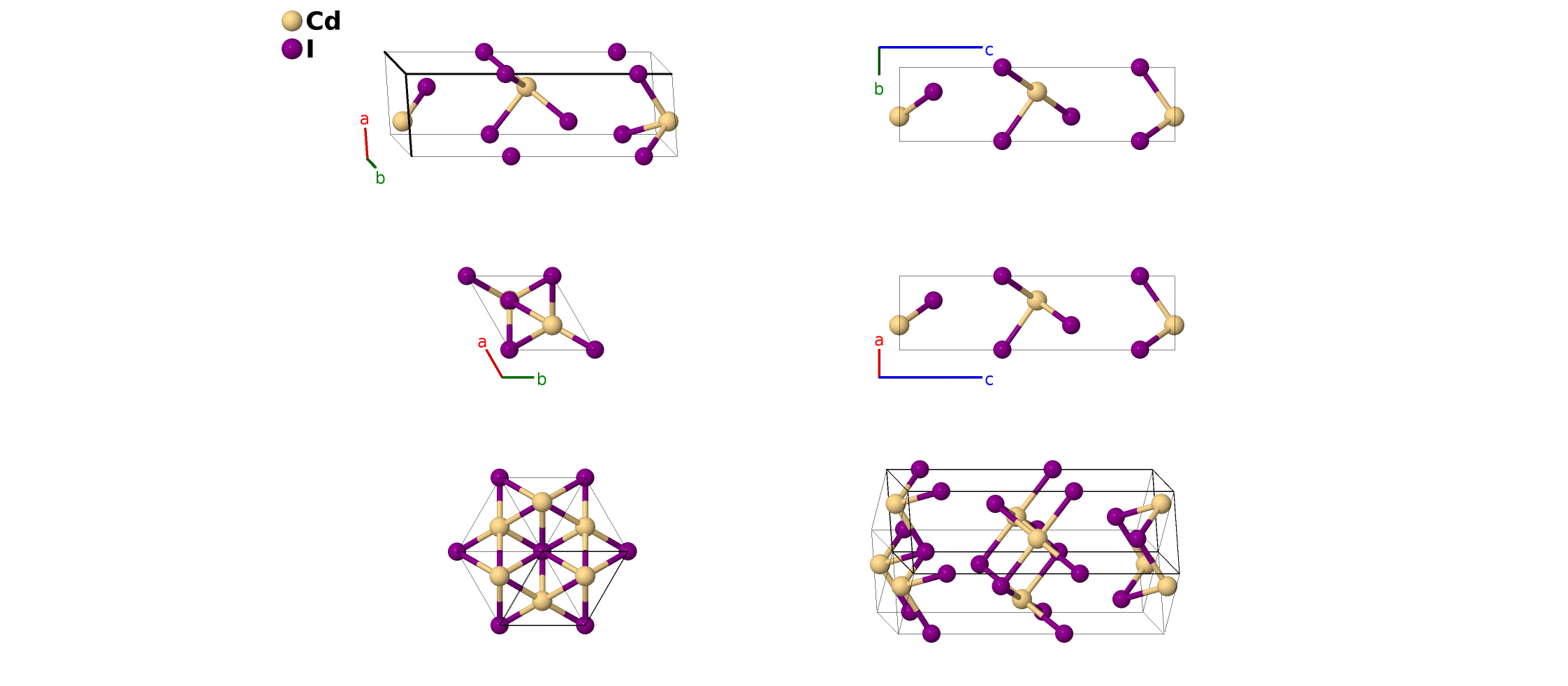 | $\mathbf{B_{4}}$ | = | $\frac{2}{3} \, \mathbf{a}_{1}+\frac{1}{3} \, \mathbf{a}_{2}+\left(z_{2} + \frac{1}{2}\right) \, \mathbf{a}_{3}$ | = | $\frac{1}{2}a \,\mathbf{\hat{x}}- \frac{\sqrt{3}}{6}a \,\mathbf{\hat{y}}+c \left(z_{2} + \frac{1}{2}\right) \,\mathbf{\hat{z}}$ | (2b) | Cd I |
