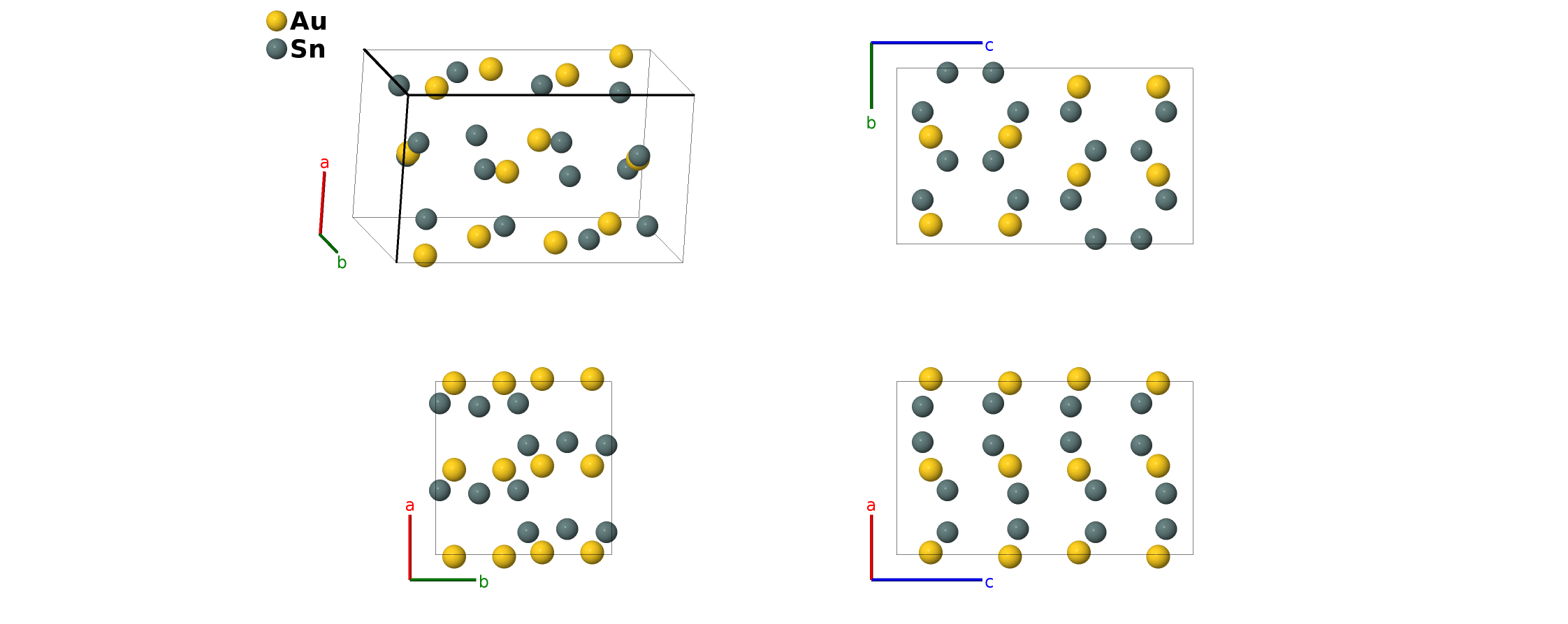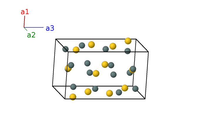 | $\mathbf{B_{3}}$ | = | $- x_{1} \, \mathbf{a}_{1}+\left(y_{1} + \frac{1}{2}\right) \, \mathbf{a}_{2}- \left(z_{1} - \frac{1}{2}\right) \, \mathbf{a}_{3}$ | = | $- a x_{1} \,\mathbf{\hat{x}}+b \left(y_{1} + \frac{1}{2}\right) \,\mathbf{\hat{y}}- c \left(z_{1} - \frac{1}{2}\right) \,\mathbf{\hat{z}}$ | (8c) | Au I |