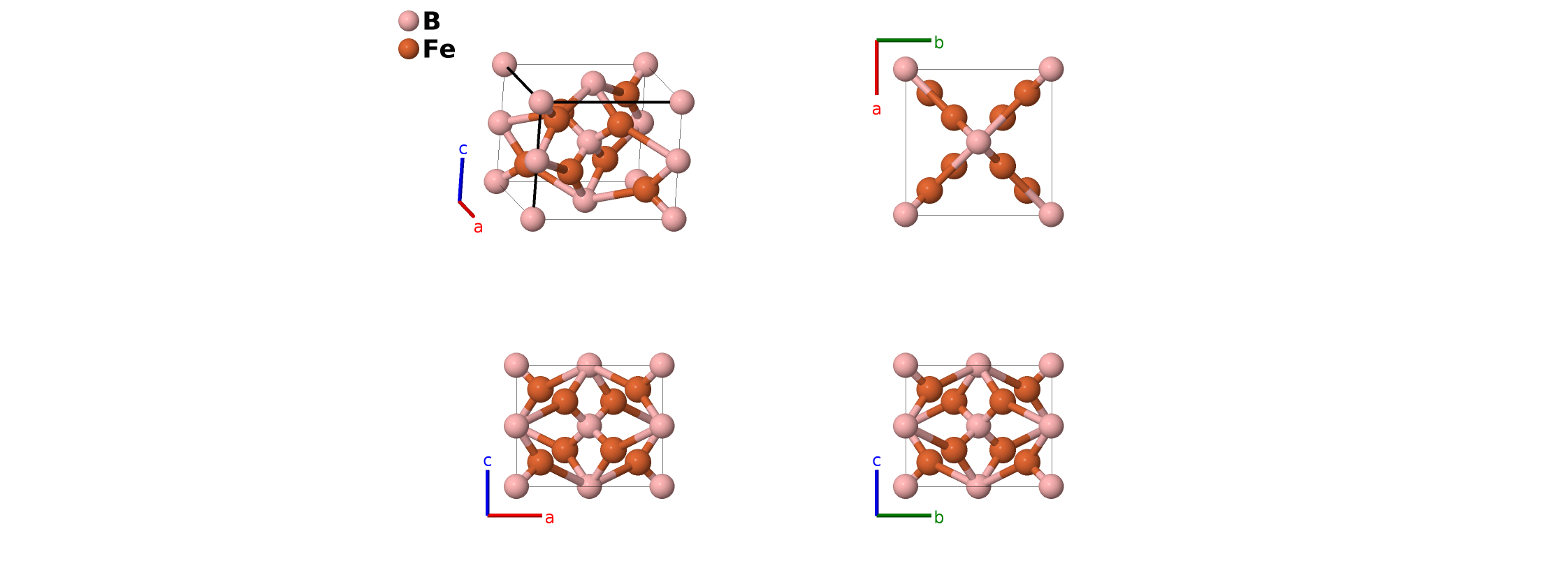 | $\mathbf{B_{6}}$ | = | $\left(x_{3} - z_{3}\right) \, \mathbf{a}_{1}- \left(x_{3} + z_{3}\right) \, \mathbf{a}_{2}$ | = | $- a x_{3} \,\mathbf{\hat{x}}+a x_{3} \,\mathbf{\hat{y}}- c z_{3} \,\mathbf{\hat{z}}$ | (8i) | Fe I |
