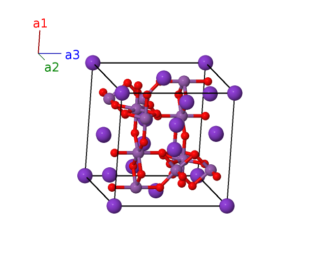 | $\mathbf{B_{43}}$ | = | $- \left(z_{5} - \frac{1}{2}\right) \, \mathbf{a}_{1}- \left(x_{5} - \frac{1}{2}\right) \, \mathbf{a}_{2}+y_{5} \, \mathbf{a}_{3}$ | = | $- a \left(z_{5} - \frac{1}{2}\right) \,\mathbf{\hat{x}}- a \left(x_{5} - \frac{1}{2}\right) \,\mathbf{\hat{y}}+a y_{5} \,\mathbf{\hat{z}}$ | (24h) | O II |