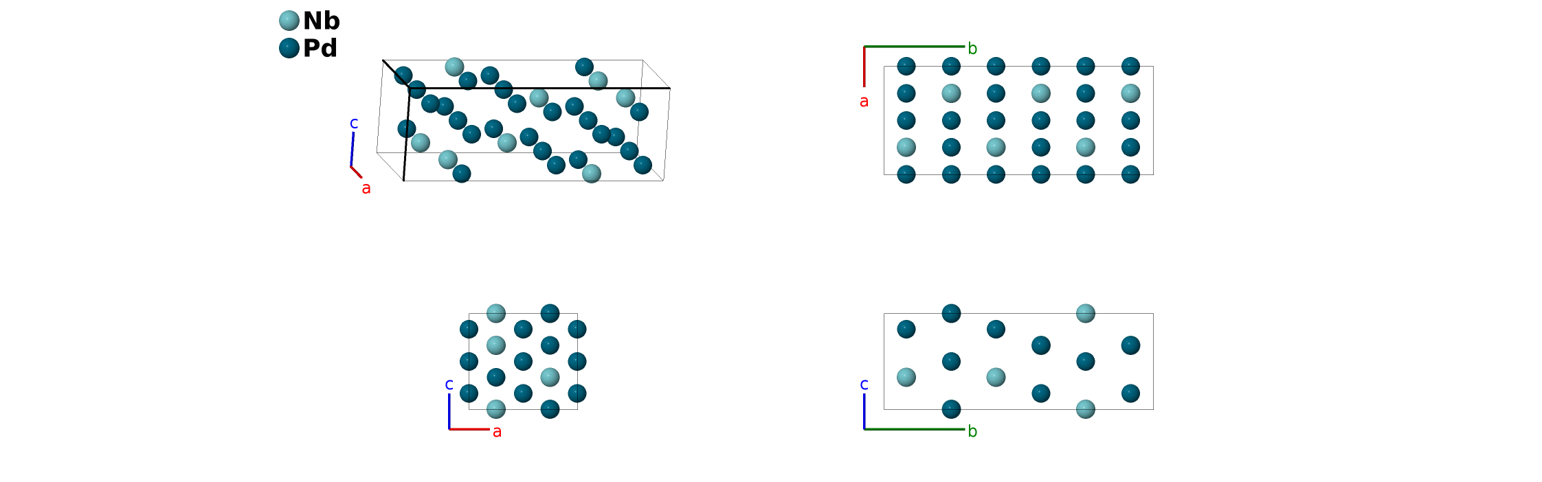 | $\mathbf{B_{3}}$ | = | $\frac{1}{4} \, \mathbf{a}_{1}+\frac{3}{4} \, \mathbf{a}_{2}+z_{2} \, \mathbf{a}_{3}$ | = | $\frac{1}{4}a \,\mathbf{\hat{x}}+\frac{3}{4}b \,\mathbf{\hat{y}}+c z_{2} \,\mathbf{\hat{z}}$ | (2b) | Pd I |