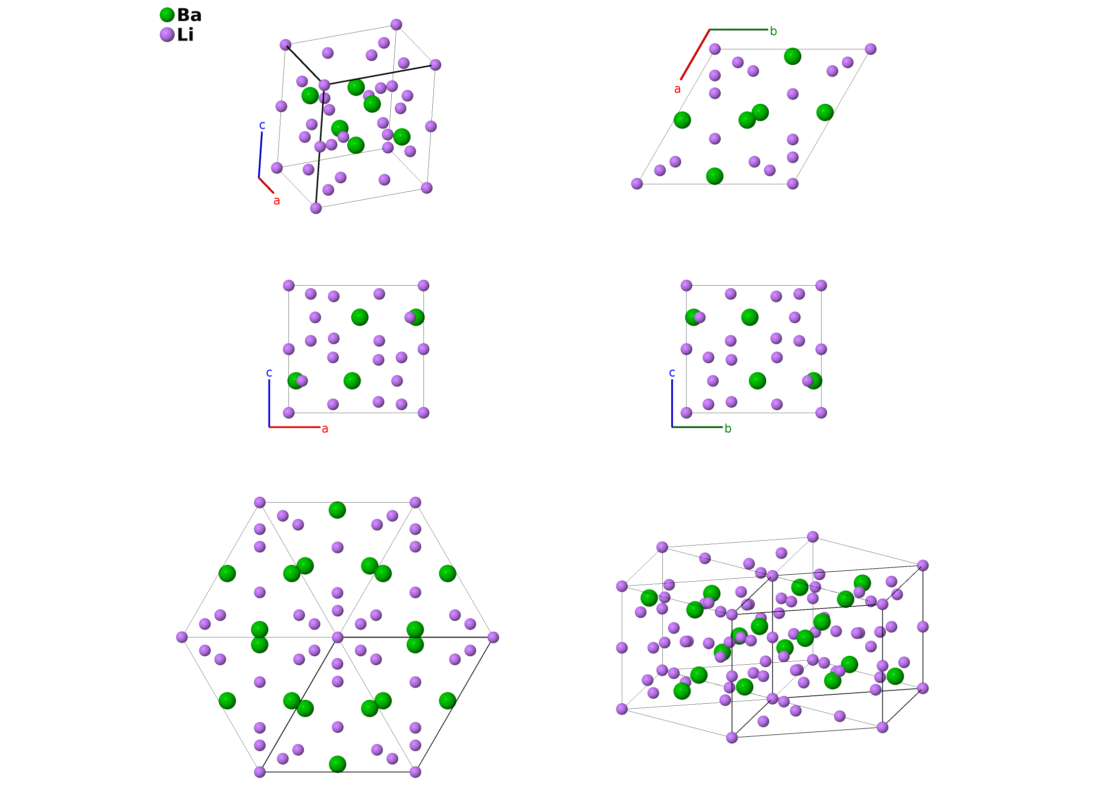 | $\mathbf{B_{5}}$ | = | $\frac{2}{3} \, \mathbf{a}_{1}+\frac{1}{3} \, \mathbf{a}_{2}- z_{2} \, \mathbf{a}_{3}$ | = | $\frac{1}{2}a \,\mathbf{\hat{x}}- \frac{\sqrt{3}}{6}a \,\mathbf{\hat{y}}- c z_{2} \,\mathbf{\hat{z}}$ | (4f) | Li II |