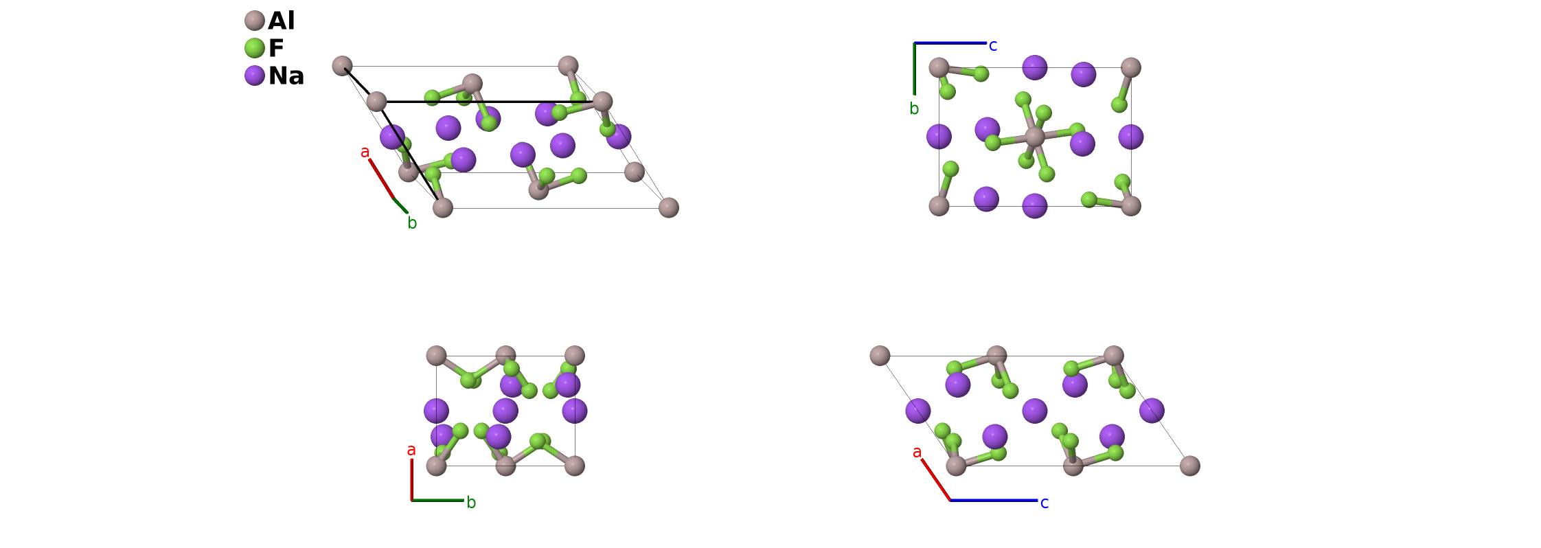 • Cryolite undergoes a phase transition to an orthorhombic $Immm$ #71 phase at 890K. Here we use structural data taken at 295K.