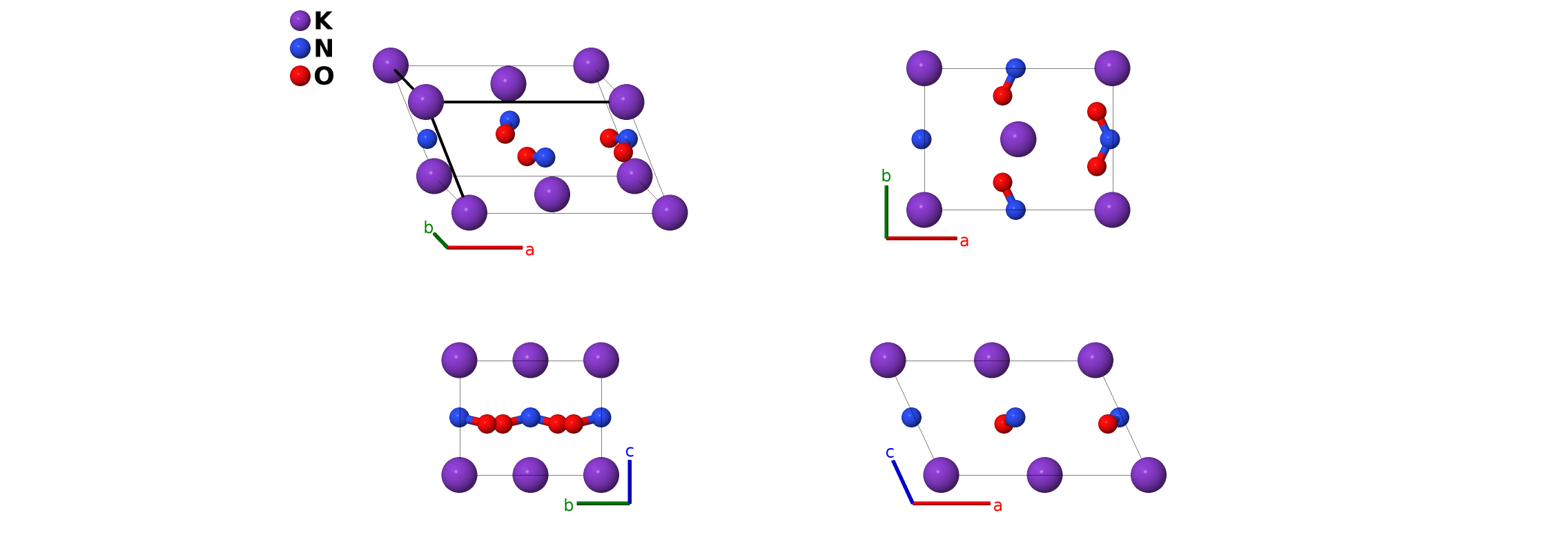 • G. E. Ziegler, The Crystal Structure of Potassium Nitrite, KNO$_{2}$, Z. Kristallogr. A 94, 491–499 (1936), doi:10.1524/zkri.1936.94.1.491.