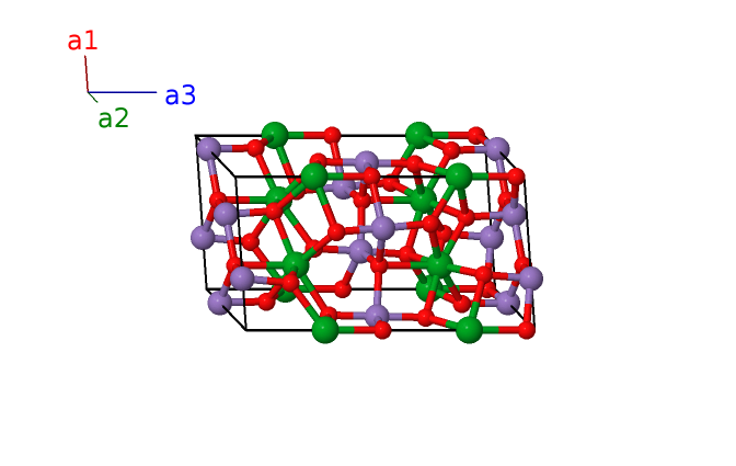 | $\mathbf{B_{12}}$ | = | $\frac{2}{3} \, \mathbf{a}_{1}+\frac{1}{3} \, \mathbf{a}_{2}+z_{4} \, \mathbf{a}_{3}$ | = | $\frac{1}{2}a \,\mathbf{\hat{x}}- \frac{\sqrt{3}}{6}a \,\mathbf{\hat{y}}+c z_{4} \,\mathbf{\hat{z}}$ | (4b) | O II |