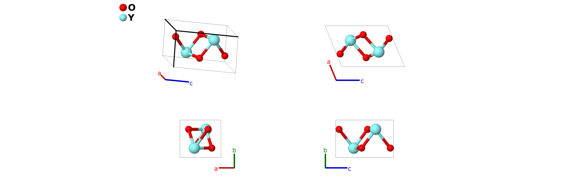 | $\mathbf{B_{5}}$ | = | $x_{3} \, \mathbf{a}_{1}+\frac{1}{4} \, \mathbf{a}_{2}+z_{3} \, \mathbf{a}_{3}$ | = | $\left(a x_{3} + c z_{3} \cos{\beta}\right) \,\mathbf{\hat{x}}+\frac{1}{4}b \,\mathbf{\hat{y}}+c z_{3} \sin{\beta} \,\mathbf{\hat{z}}$ | (2e) | Y I |