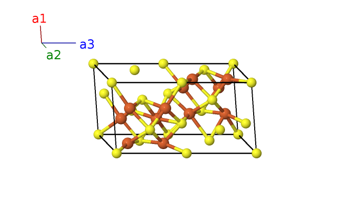 | $\mathbf{B_{19}}$ | = | $y_{4} \, \mathbf{a}_{1}+x_{4} \, \mathbf{a}_{2}- z_{4} \, \mathbf{a}_{3}$ | = | $\frac{1}{2}a \left(x_{4} + y_{4}\right) \,\mathbf{\hat{x}}+\frac{\sqrt{3}}{2}a \left(x_{4} - y_{4}\right) \,\mathbf{\hat{y}}- c z_{4} \,\mathbf{\hat{z}}$ | (12i) | Fe I |