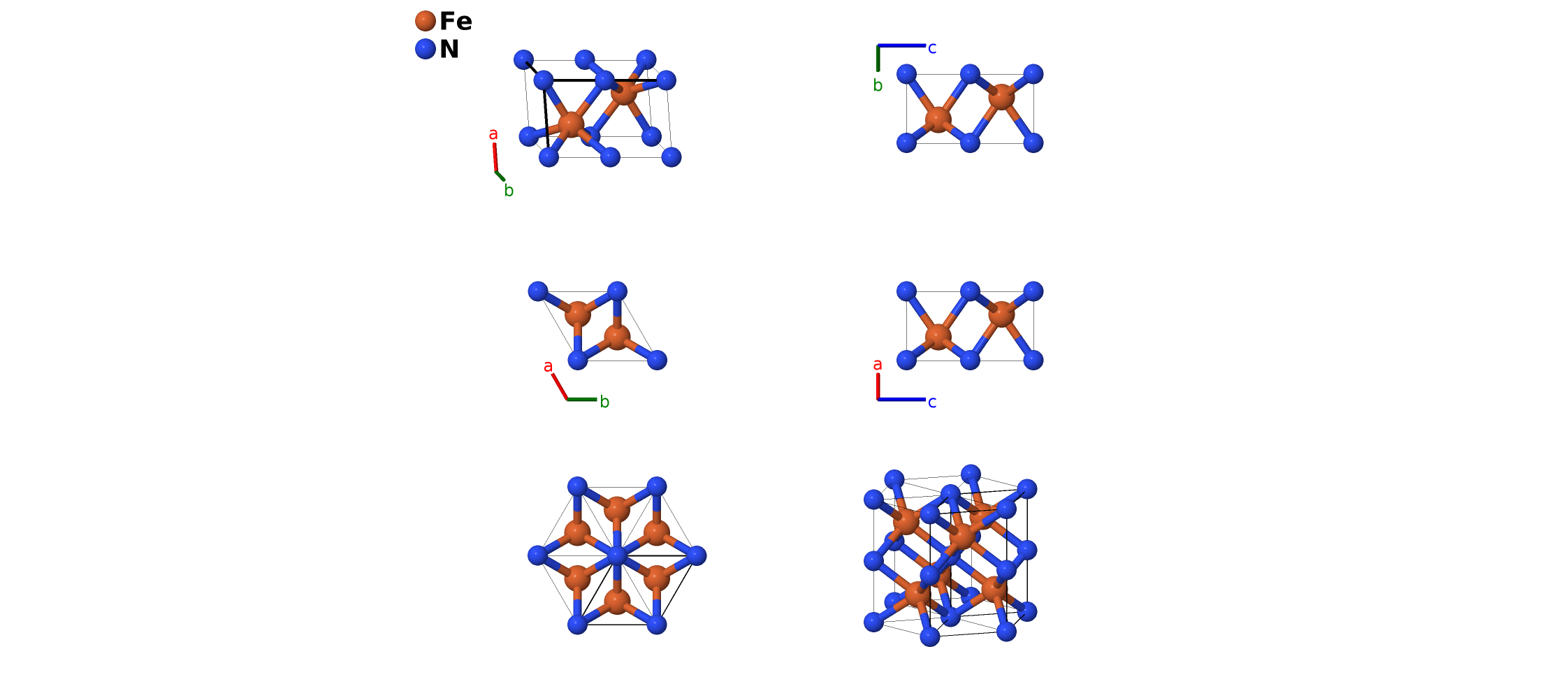 We take the lattice constants for this structure from the Fe-Fe distances in $\epsilon$–Fe$_{2}$N provided by (Hendricks, 1930), though this is not the structure described by Hendricks.