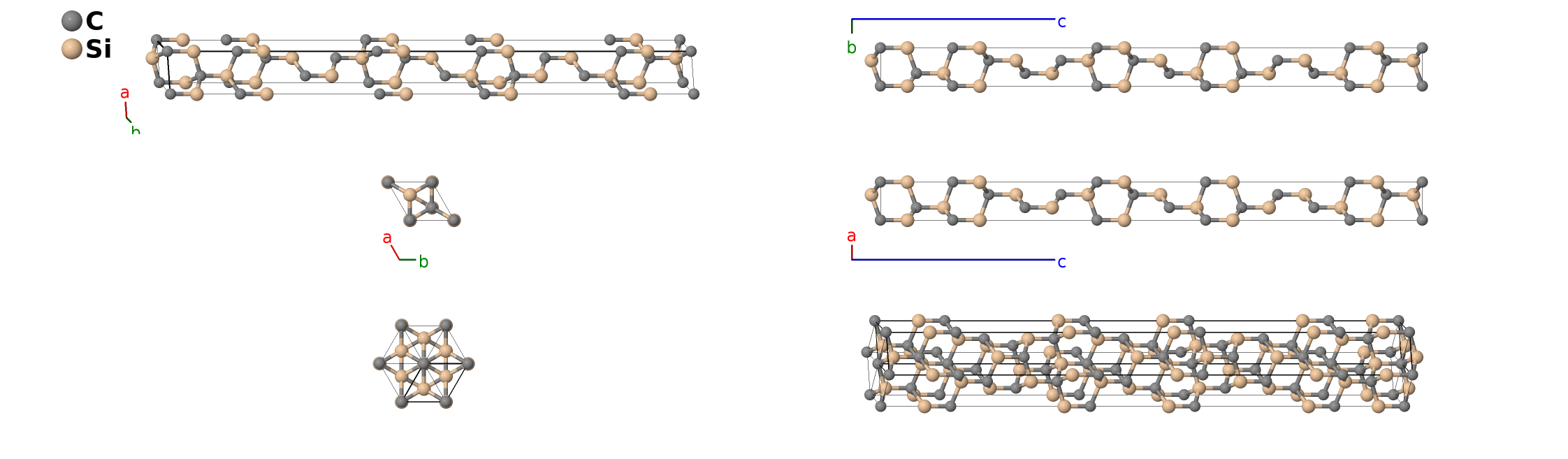 Type I $\alpha$-silicon carbide.The atomic positions are not well determined. We follow (Thibault, 1944) and assume that the (0001) planes of carbon atoms are equally spaced, and that each carbon atom has a silicon atom at a distance of $c/20$ along the $z$ axis.