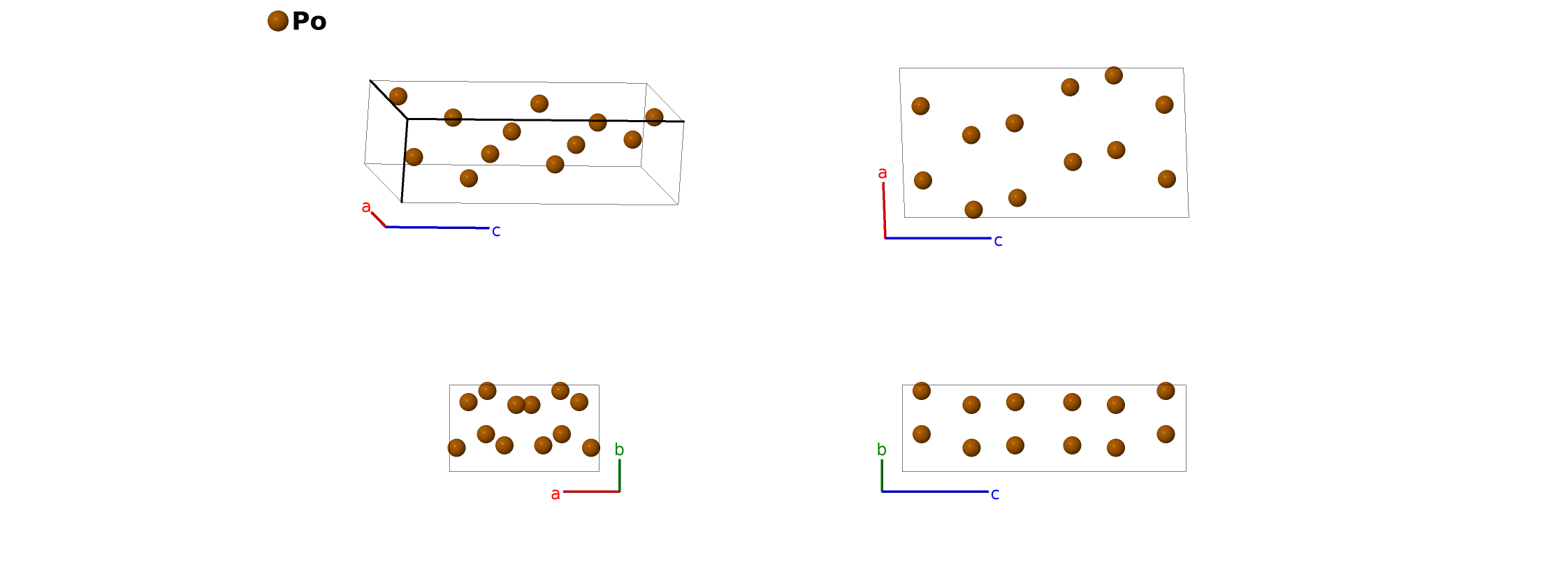 | $\mathbf{B_{5}}$ | = | $\left(x_{3} - y_{3}\right) \, \mathbf{a}_{1}+\left(x_{3} + y_{3}\right) \, \mathbf{a}_{2}+z_{3} \, \mathbf{a}_{3}$ | = | $\left(a x_{3} + c z_{3} \cos{\beta}\right) \,\mathbf{\hat{x}}+b y_{3} \,\mathbf{\hat{y}}+c z_{3} \sin{\beta} \,\mathbf{\hat{z}}$ | (4c) | Po III |