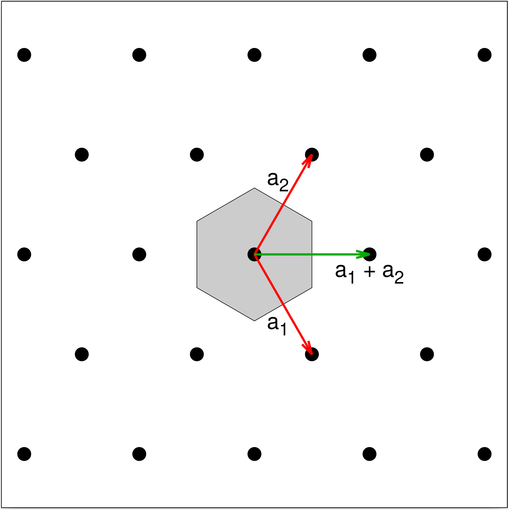 Wigner-Seitz cell shaded in dark gray. The green